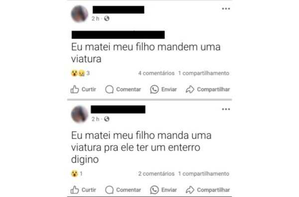 “Eu matei meu filho, mandem uma viatura para ele ter um enterro digno”, explicou na publicação. Além da confissão, a mulher também publicou o endereço dela.